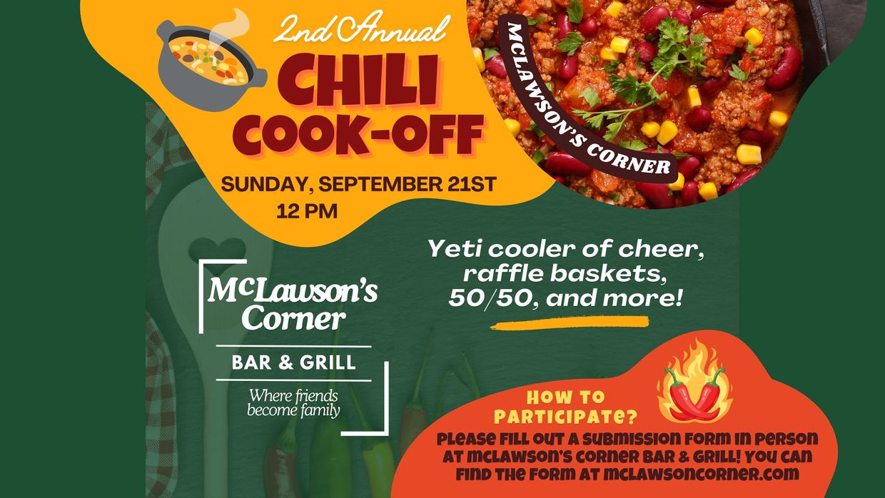 This year’s event will take place on September 21st at 12:00pm. Think your chili can take the crown? Get your recipes ready - download and print the submission form below and drop it off at McLawson's Corner Bar & Grill. This year we are raising money in support of Breakthrough T1D (type 1 diabetes), a cause very near and dear to the McLawson's family. There will be a Yeti cooler of cheer, raffle baskets, a 50/50, and more! It's fun for the whole family for an amazing cause!